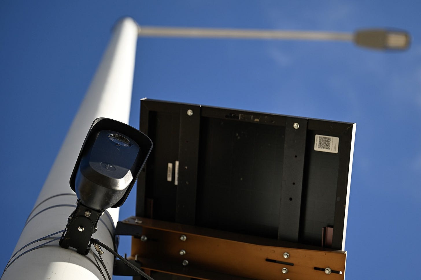 A Flock Safety license plate recognition camera is seen on a street light post on Ken Pratt Boulevard near the intersection with U.S. 287 in Longmont on Wednesday, Dec. 10, 2025. (Photo by Matthew Jonas/MediaNews Group/Boulder Daily Camera via Getty Images. Source.)