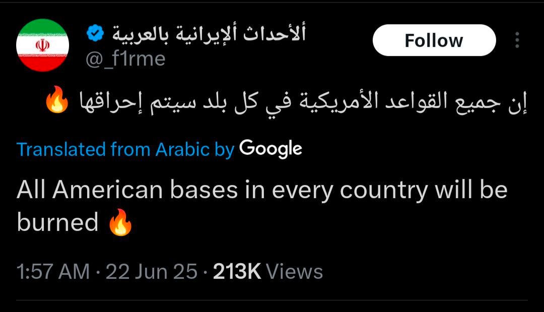 "Mr. President, you started it, we will finish it. Look at the map. All American bases in the region are within the range of Iranian missiles. From Iraq to Syria, from Yemen to the Persian Gulf, and from Jordan to the Arabian Sea. All these bases are within the range of Iranian missiles. The ballistic missiles that targeted the Zionist regime came from these very bases. Mr. President, you started it, we will finish it."