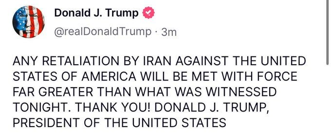 In the same message, the US leader appeared to urge Tehran not to retaliate and to engage in talks, claiming it was now “time for peace.”