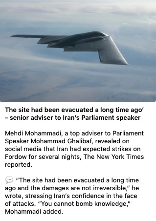 “We have completed our very successful attack on the three Nuclear sites in Iran, including Fordow, Natanz, and Esfahan,” Trump wrote. “All planes are now outside of Iran air space. A full payload of BOMBS was dropped on the primary site, Fordow. All planes are safely on their way home.”