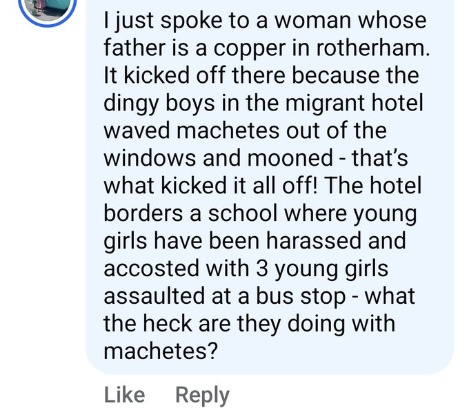 I'm not sharing riot videos from Sheffield to not get arrested by Starmer's Reich but I am seeing videos of people looking like Gladio-B operatives of military age roaming the streets with had held weapons such as knives & machetes etc.