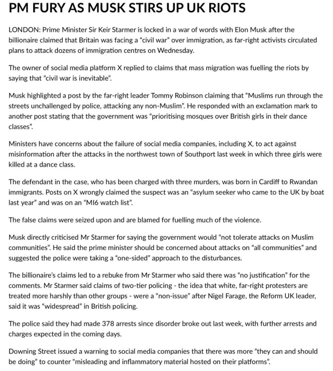 UK Prime Minister Clashes with Elon Musk over Riots