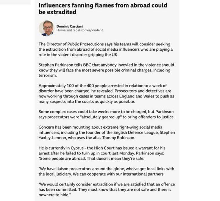The director of public prosecutions, Stephen Parkinson, announced that extradition could be sought for social media influencers fueling violent disorder in the UK from abroad. Over 100 of the 400 arrested related to a week of disturbances have been charged. Investigations continue into right-wing influencers like Stephen Yaxley-Lennon, known as Tommy Robinson, currently in Cyprus.