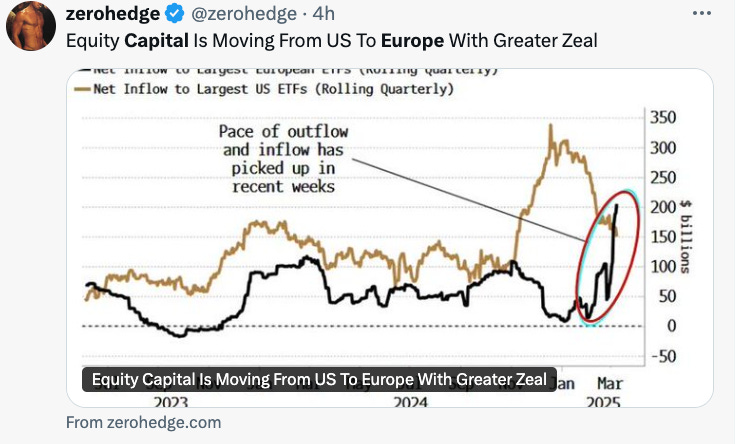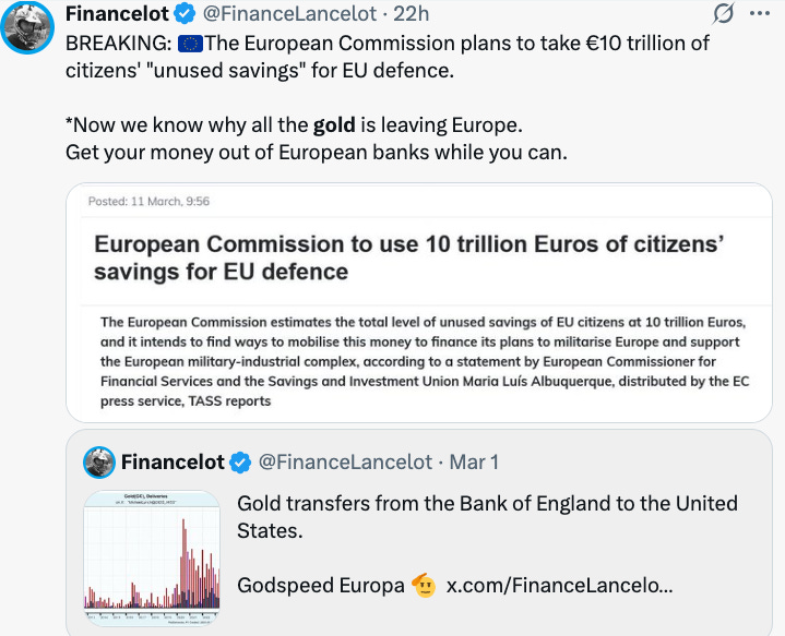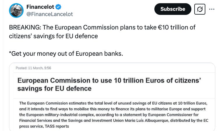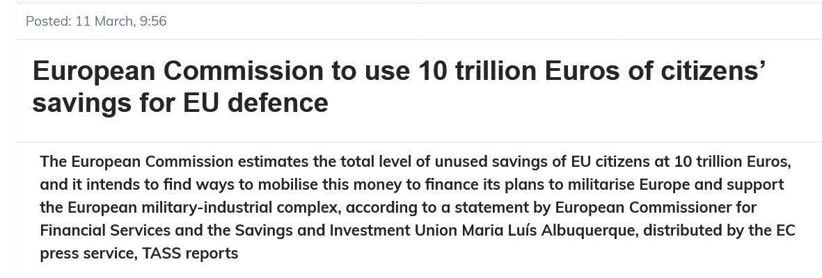 The word about 10 TRILLION leaving Europe is apparently spawned by the announcement two days ago saying the European Commission has determined there are ten trillion EUROS sitting dormant in SAVINGS ACCOUNTS, and the EU is going to "mobilize" that money to feed the European military-industrial-complex to re-arm Europe!