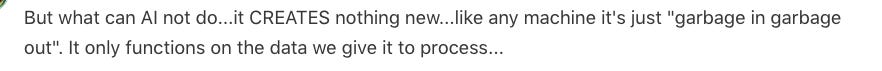 Yeah, I noticed a lot of your AI articles seem to have fewer comments than they deserve. There's room for a variety of perspectives on it, but the paucity of those perspectives actually being shared doesn't bode well. But preconceptions have always been a thing. I'm skeptical of the idea that AI is going to fulfill all that many new and novel functions as opposed to just doing existing jobs more efficiently, but I wouldn't count it out. It's evolving quickly and even fairly conservative estimations of what it can do could be very disruptive.