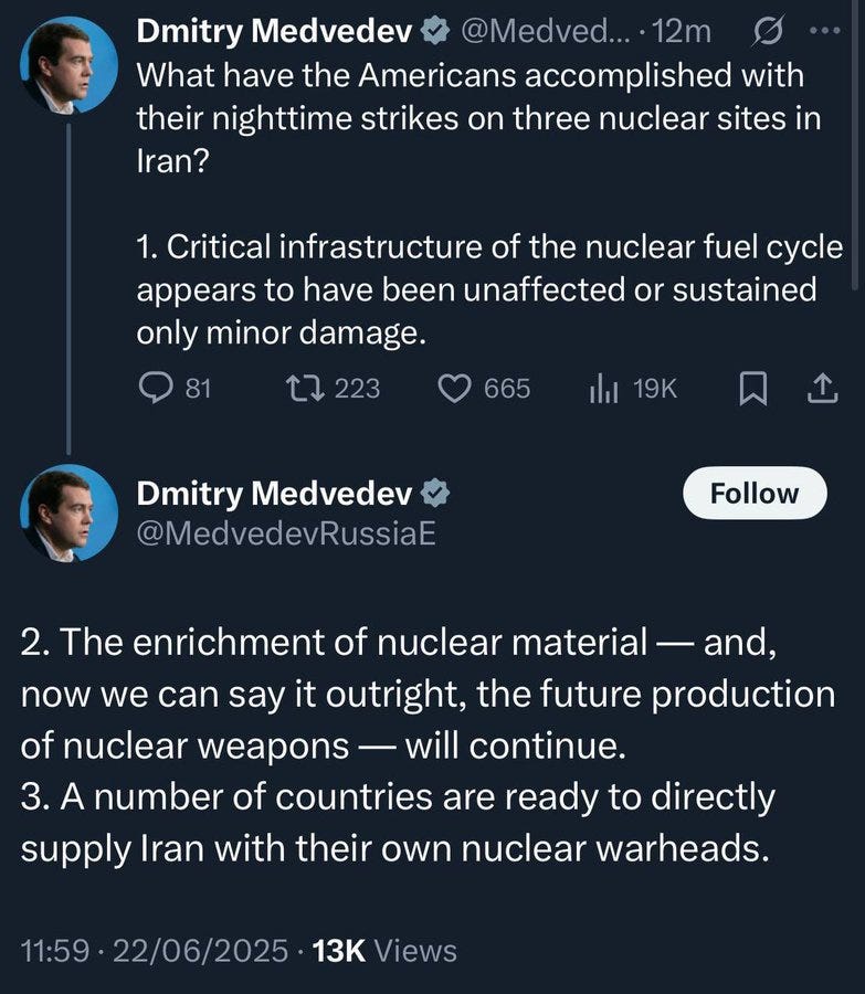 Serious words too, this morning, out of Russia. Former Russian President Dmitry Medvedev posted this on social media: