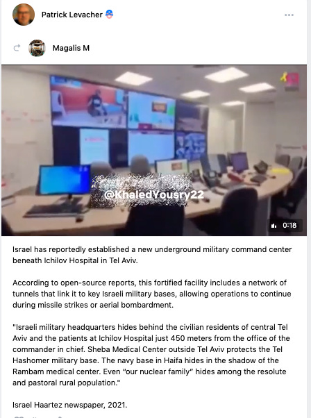 According to Israeli Channel 13, Ichilov Hospital doubles as a concealed military facility, complete with subterranean command tunnels linking it to nearby IDF headquarters — all within a 450-meter radius.