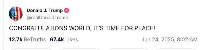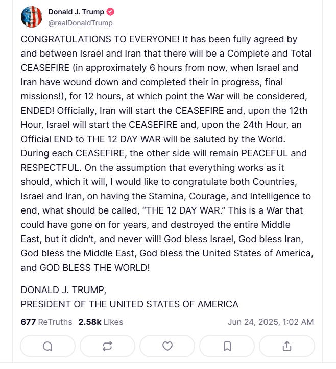 “On the assumption that everything works as it should, which it will, I would like to congratulate both Countries, Israel and Iran, on having the Stamina, Courage, and Intelligence to end, what should be called, ‘THE 12 DAY WAR’,” Trump wrote on his Truth Social site.