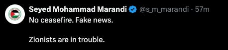 “Officially, Iran will start the CEASEFIRE and, upon the 12th Hour, Israel will start the CEASEFIRE and, upon the 24th Hour, an Official END to THE 12 DAY WAR will be saluted by the World. During each CEASEFIRE, the other side will remain PEACEFUL and RESPECTFUL,” he added.