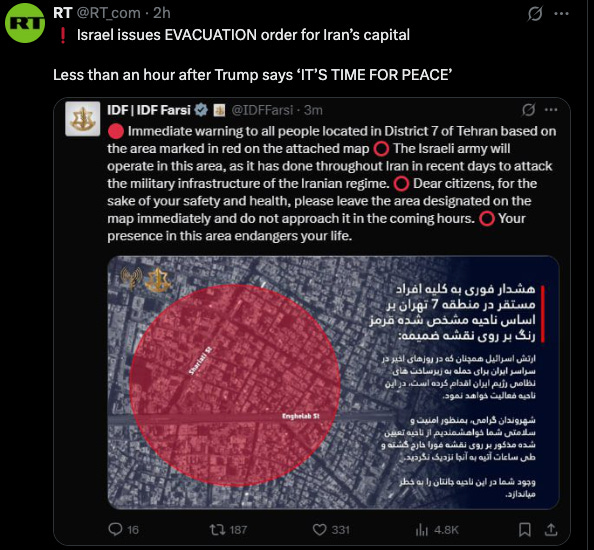 The latest escalation follows US President Donald Trump’s decision to strike Iranian nuclear facilities in Fordow, Natanz, and Esfahan. After announcing the strike in a post on Truth Social, the US leader repeatedly urged Tehran not to retaliate and to engage in talks, claiming it was now “time for peace.”
