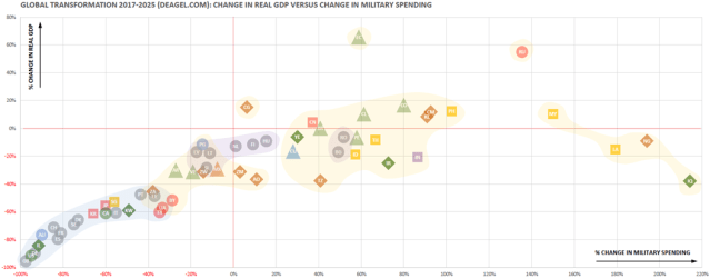 The second chart shows the prospects for a country’s relative economic well-being as a function of change in its military spending in 2025 as compared to 2017.