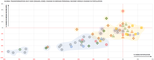 The first chart shows the prospects for an individual’s relative economic well-being as a function of population change in the relevant country in 2025 as compared to 2017.