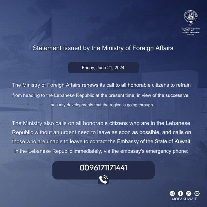 The Kuwait Ministry of Foreign Affairs has called on its Citizens to Avoid any and all Travel to Lebanon, and for all Kuwaiti Citizens currently in Lebanon to Depart as soon as possible, those Unable to Depart are expected to Contact the Kuwaiti Embassy in Beirut.