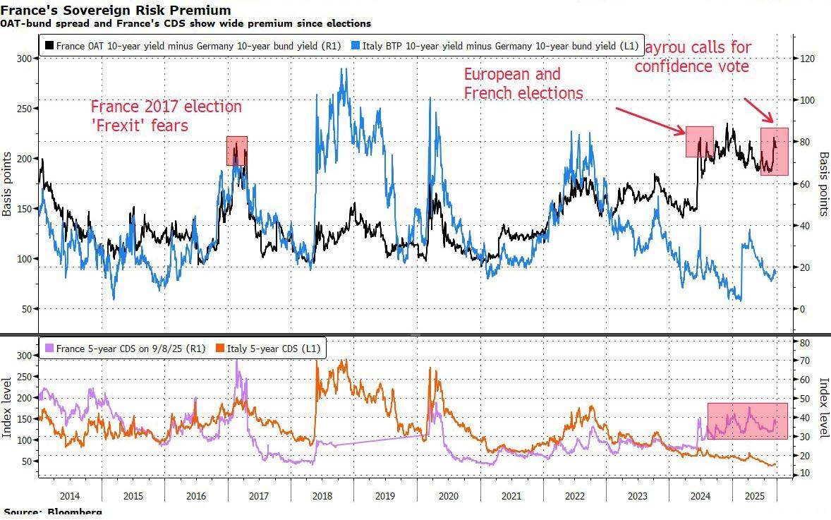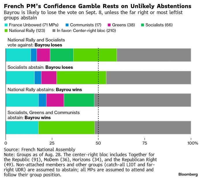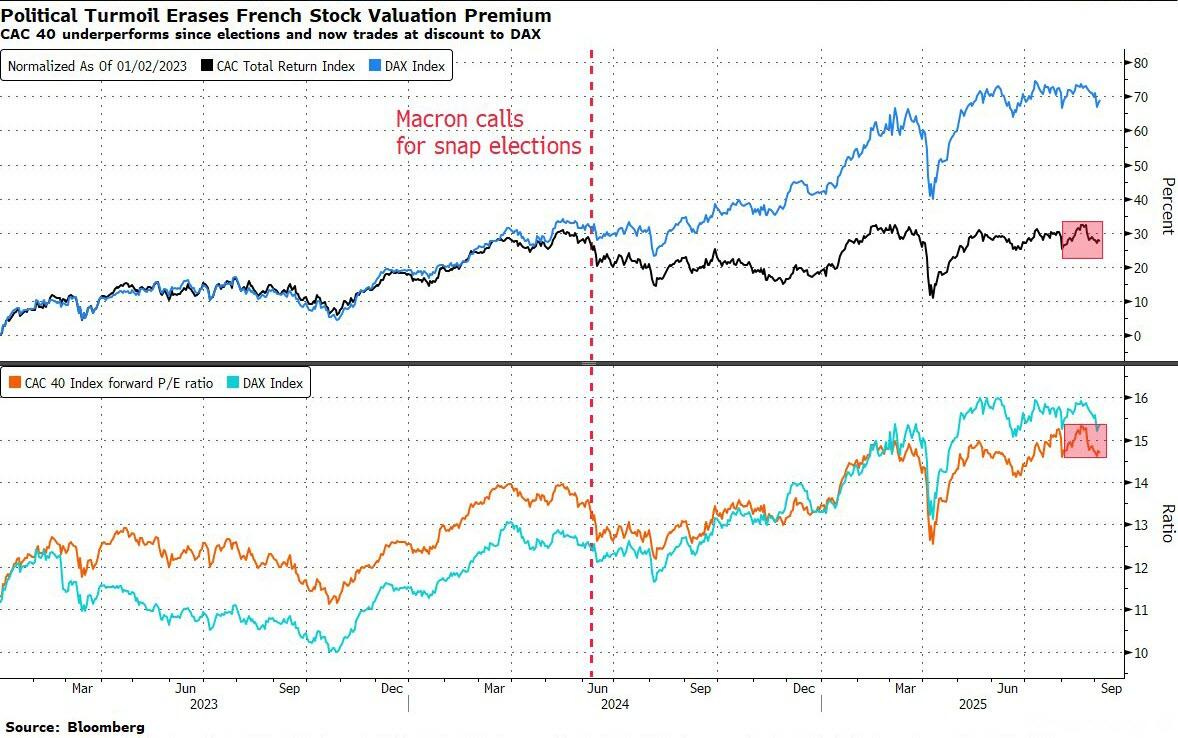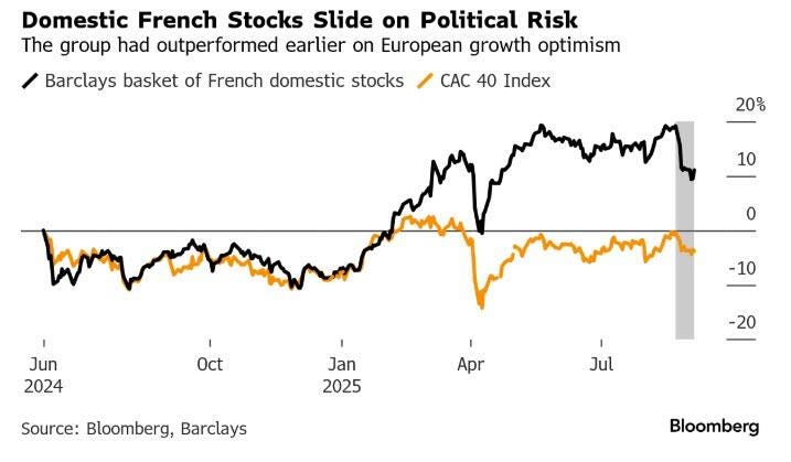 Since Prime Minister François Bayrou called a vote of confidence on Aug. 25, the CAC 40 Index has fallen more than a broad European stock benchmark. The extra yield investors demand to hold French 10-year government bonds over German bunds has surged. Even so, French assets aren’t yet pricing the instability that can unfold over the coming weeks or months.