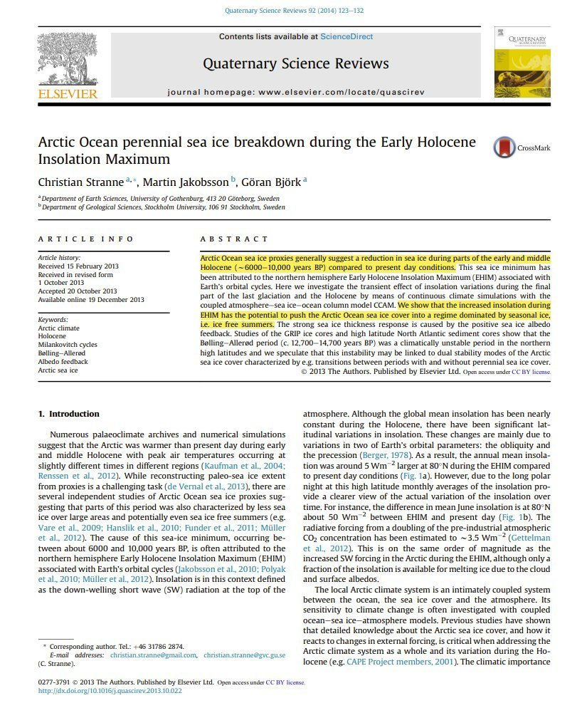 𝗦𝘁𝗿𝗮𝗻𝗻𝗲 𝗲𝘁 𝗮𝗹. (𝟮𝟬𝟭𝟯): “Arctic ocean sea ice proxies generally suggest a reduction in sea ice during parts of the early and middle Holocene (~6,000-10,000 years BP) compared to present day conditions...
