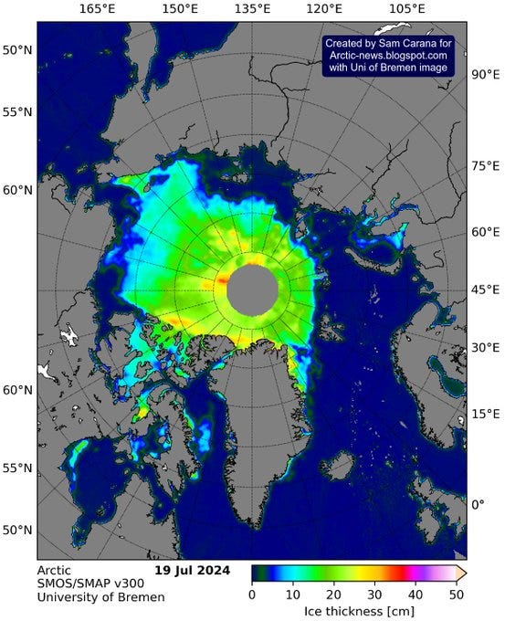 Most thick sea ice has melted in the Arctic, i.e. the latent heat buffer has virtually disappeared. This and further feedbacks and events (e.g. high sunspots) may cause temperatures to keep rising, even while La Niña is expected to prevail in Aug-Oct 2024