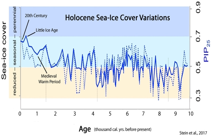 𝗦𝘁𝗲𝗶𝗻 𝗲𝘁 𝗮𝗹. (𝟮𝟬𝟭𝟳): “The increase in sea ice extent during the late Holocene seems to be a circum-Arctic phenomenon as PIP25-based sea ice records from the Fram Strait, Laptev Sea, East Siberian Sea and Chukchi Sea display a generally quite similar evolution, all coinciding with the decrease in solar radiation... This interval of maximum summer insolation [during the early Holocene] is characterized by a minimum sea ice cover, also observed in other Arctic Ocean areas. This minimum in sea ice correlates with the Early Holocene Thermal Maximum characterized by overall warmer sub-arctic and arctic climatic conditions.”