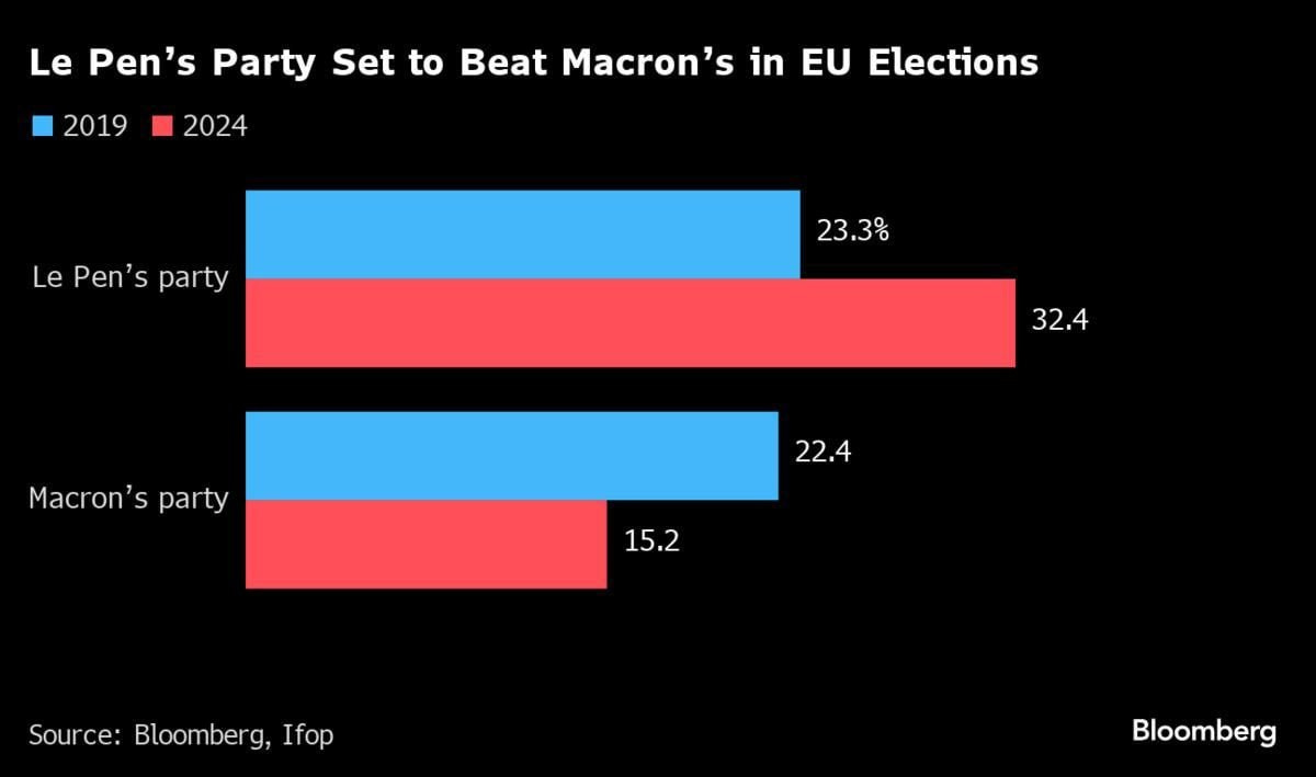 Bardella and Le Pen humiliate Macron in European elections. Macron dissolves National Assembly and calls new elections in a month. pic.twitter.com/oSDnUjl5EJ