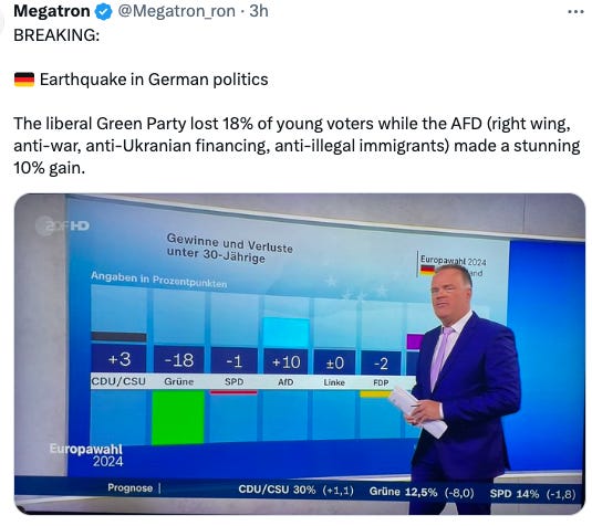 According to preliminary results from five countries, right-wing parties are estimated to have won at least 33 of the 174 seats available in Austria, Cyprus, Germany, Greece and the Netherlands, according to official exit polls from those countries, up from 19 seats at the last election in 2019. And - as the ultraliberal FT admits - "the surge, at the expense of liberal and Green parties, would complicate European commission president Ursula von der Leyen’s bid for a second term as head of the EU’s executive."