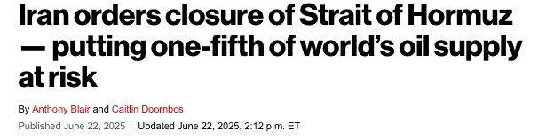 As I write this, subsequent to yesterday's attack by the US the Iranian parliament has voted to close the Straits of Hormuz and already acted.