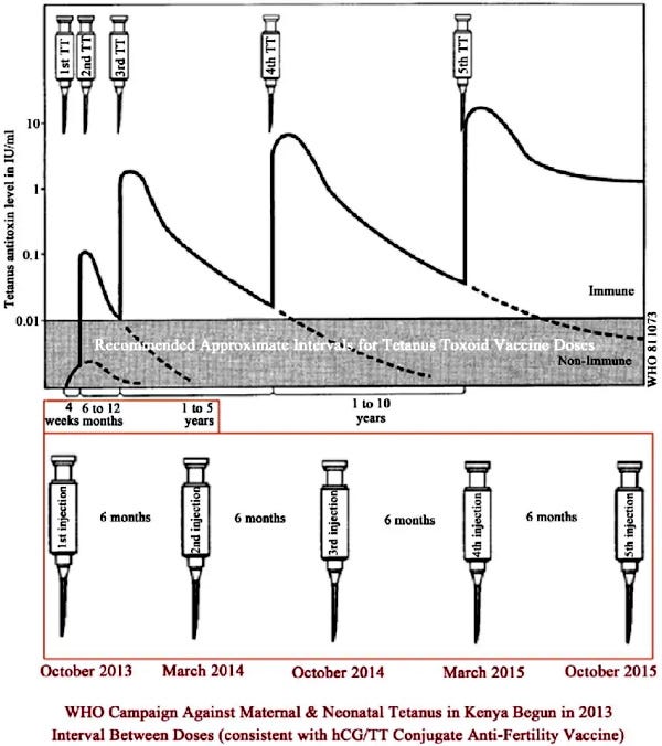 They neglected to include in their statement that the WHO announced a “birth-control vaccine” for “family planning” in 1976 when WHO researchers had “conjugated tetanus toxoid (TT) with human chorionic gonadotropin (hCG), producing a “birth-control” vaccine. Conjugating TT with hCG causes pregnancy hormones to be attacked by the immune system. Expected results are [spontaneous] abortions in pregnant females and/or infertility in recipients not yet impregnated. Repeated inoculations prolong infertility.”