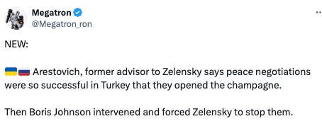 Putin said last week that the only reason the Istanbul deal failed was because of “the wish of the elites in the US and some European nations to inflict a strategic defeat on Russia,” adding that Boris Johnson served as the messenger to quash the peace process.