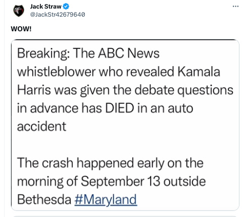 An Employee of ABC News who Blew the Whistle on the Trump-Harris Debate being **RIGGED** has been KILLED in a car accident near Bethesda, MD. I HAVE the Sworn Affidavit provided BEFORE the ABC News Debate; which outlines the rigging BEFORE the debate took place!