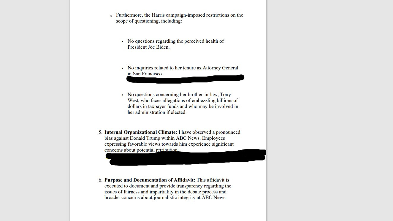A Sworn AFFIDAVIT, which appears below, from a long-time ABC News Employee, proves that ABC News conspired with the Kamala Harris for President Campaign, to literally RIG the Presidential Debate between Harris and Trump. The AFFIDAVIT was sent one full day BEFORE the debate, to Speaker Johnson at the US House of Representatives, and by Certified mail and FedEx, so as to prove the date of its filing.