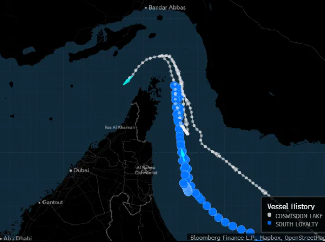 The Coswisdom Lake and South Loyalty both entered the waterway and abruptly changed course on Sunday, according to vessel tracking data compiled by Bloomberg. The first of the two carriers then did a second U-turn and is now going back through Hormuz. The other one remains outside of the Persian Gulf, according to its signals on Monday. -Bloomberg