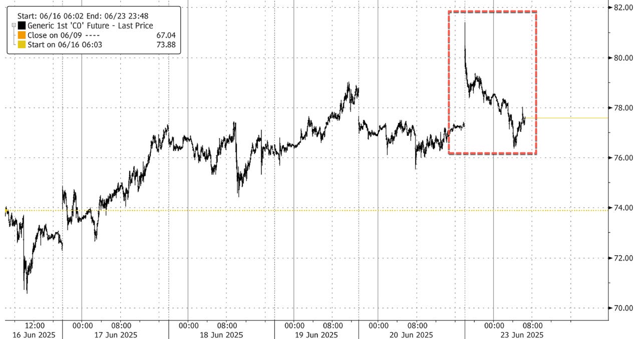 In the overnight, Brent crude futures reversed sharply—now trading around Friday's close and down 6% or so from intraday highs. UBS Research warned that the real left-tail risk remains a Strait of Hormuz closure, which would trigger a disruption larger than the 2022 Russian supply shock and could send prices soaring above $120.